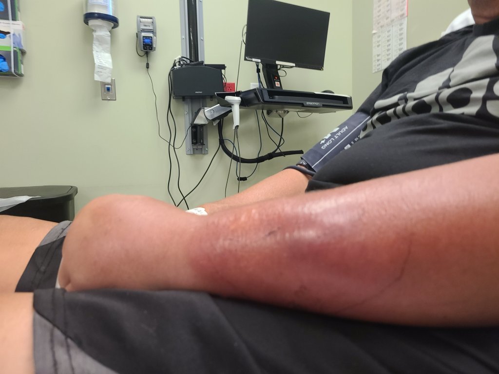 A couple of days later, his arm began to swell. It became red and hot to the touch. It became obvious the next day, a Friday, that ignoring it probably was not a good idea. He went to our family doctor, received a shot of a strong antibiotic and an oral one to start taking that same afternoon. He was told if it worsened, to go to the ER over the weekend.